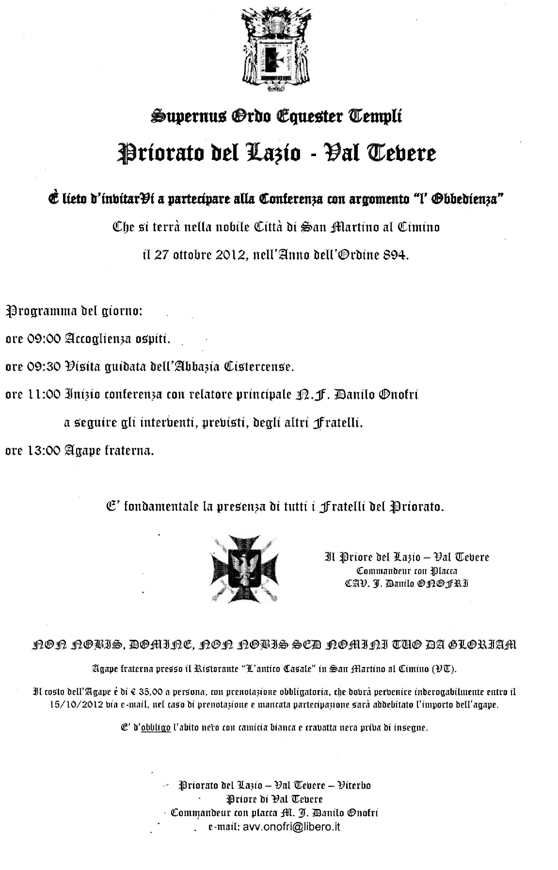 Priorato del Lazio: 21,22 novembre II Convegno Regionale presso